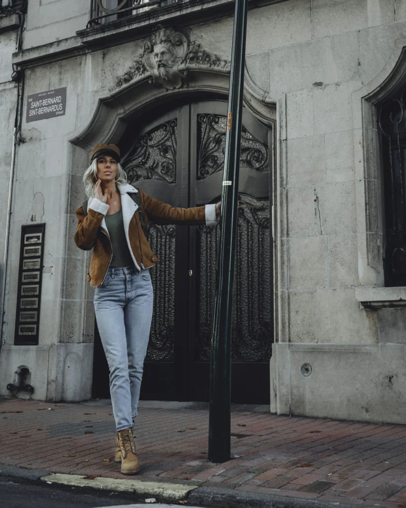 This outfit is casual, cool, and a little edgy—perfect for running errands or grabbing a coffee! The suede shearling jacket with its cozy white trim is such a stylish way to stay warm. Paired with light-wash, simple mom jeans and those classic tan lace-up boots, it’s a perfect mix of rugged and chic.