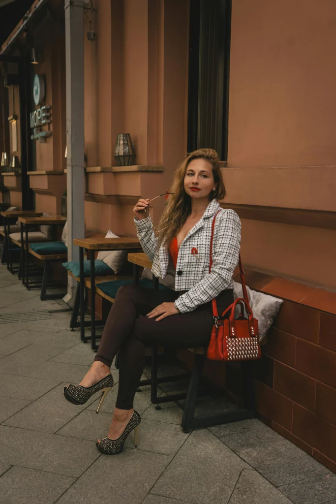 Talk about a power outfit! This look proves winter style can have major glamour. The tweed, cropped blazer with a bold black and white check is chic, and pairing it with a vibrant red bag instantly adds drama and confidence. Dark leggings and those incredible studded platform heels keep the silhouette long and sleek. Perfect for a chic coffee date or evening drinks!