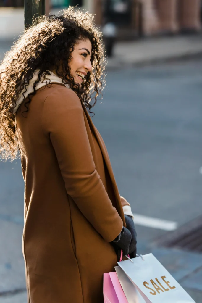 How gorgeous is this effortless, sun-drenched look? A classic camel coat is a non-negotiable winter staple—it instantly elevates any outfit. The pop of a white hood from a layered turtleneck keeps things cozy, while the big, bouncy curls add so much life. Don’t forget those comfy gloves and a few shopping bags for a perfect day out!