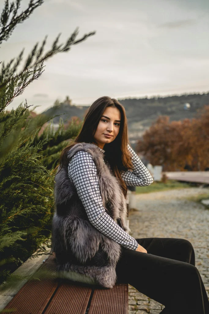 This screams cozy fall-to-winter transitional style. A plush, faux fur vest in a charcoal or grey color is the perfect way to add texture and warmth over a long-sleeved top. The graphic check pattern on the shirt peeking through gives the outfit a cool, sophisticated detail. It’s an easy, stylish look for a weekend walk in the park.