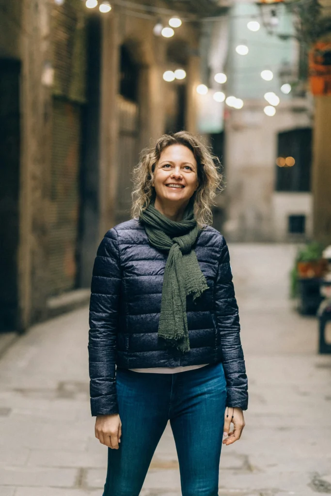 I love this effortless city style! A simple, cropped navy puffer jacket instantly adds warmth and a modern edge. The bright olive green scarf, tied casually, breaks up the darker colors and frames her face beautifully. Paired with classic blue jeans, this is your go-to outfit for a day of running errands or a casual weekend wander under the city lights.