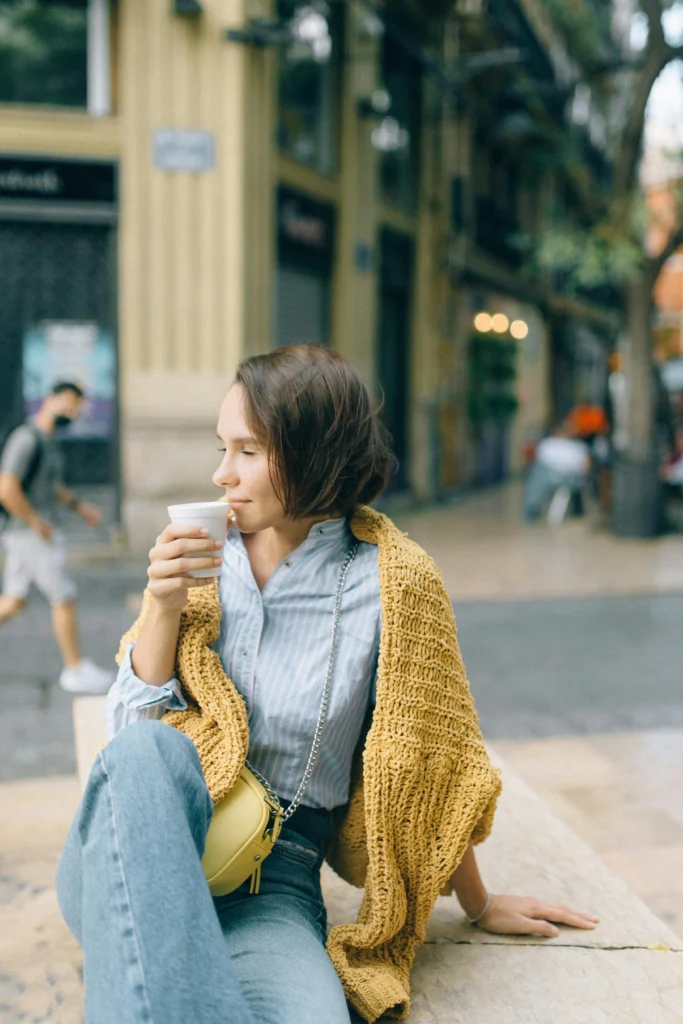 Even in cooler weather, you can still embrace a relaxed, layered look! She’s styled a classic striped shirt and jeans with a beautiful, chunky mustard yellow cardigan draped over her shoulders. It adds texture, a vibrant pop of color, and serves as a cozy layer you can easily throw on or off. The small yellow crossbody bag pulls the whole sunny palette together.