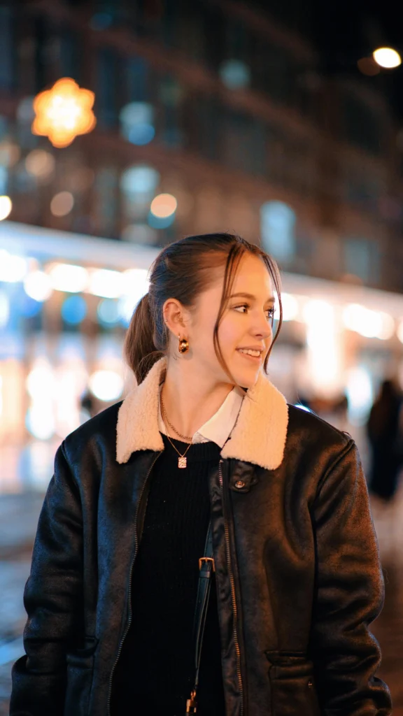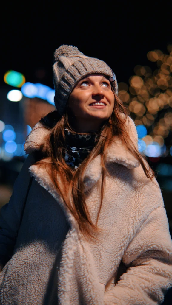This look is peak winter wonderland! The gorgeous, voluminous teddy coat in a light beige or cream looks incredibly soft and warm—it’s like being wrapped in a cloud! Paired with a ribbed knit pom-pom beanie and a patterned cowl neck, it’s a bright, cozy ensemble that looks amazing against the backdrop of night lights.