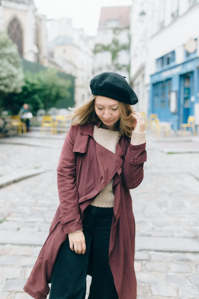 How to get the look: Invest in a stylish, dramatic long trench or duster coat in a rich color like plum or burgundy. A simple beret immediately elevates the look. Keep the base layers neutral to let the coat and hat shine.