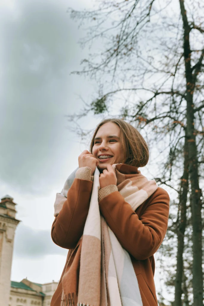How to get the look: Grab a timeless wool or felt coat in a warm hue like camel or rust. Pair it with an oversized, chunky patterned scarf and wrap it tightly around your neck—the bigger and cozier the scarf, the better the final look!