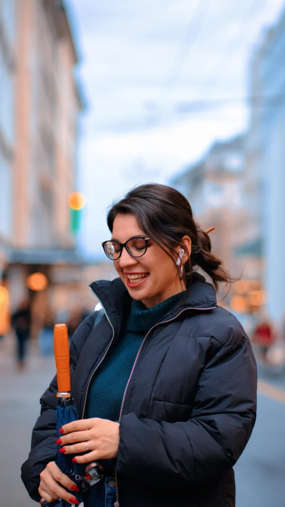 Who says a rainy day can’t be stylish? This look is all about practicality and a pop of color. The structured black puffer jacket is a winter staple, but the bright teal turtleneck sweater underneath makes the outfit special. The colorful umbrella adds a cheerful touch, proving that functional pieces can also be fashionable.