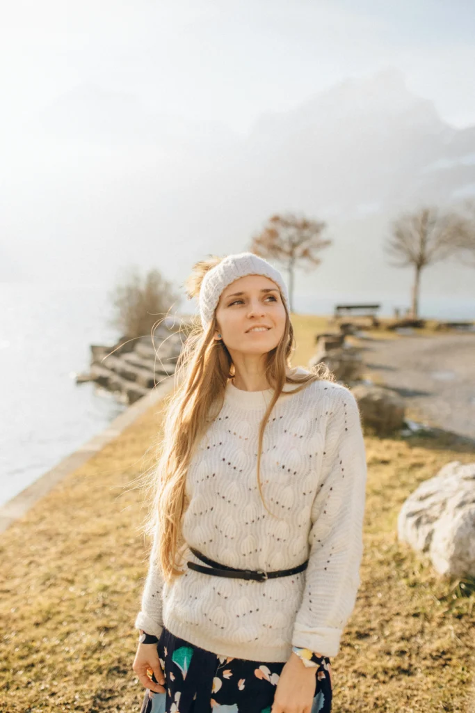 This look is pure winter daydreaming. She’s rocking a gorgeous cream cable-knit sweater belted over a dark, patterned skirt—a genius way to transition a summer skirt. The white pom-pom beanie and long, flowing hair just complete that soft, ethereal vibe. It’s the perfect balance of cozy and chic for a bright, chilly day outdoors.