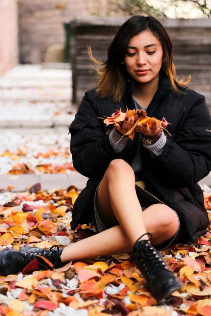 This is the ultimate autumn aesthetic! The puffer coat and cozy gray knit sweater are perfect for snuggling up when the weather turns crisp. The lace-up combat boots are a great practical yet stylish choice for crunching through colorful leaves. It’s a sweet, relaxed look that really captures the best part of the season.