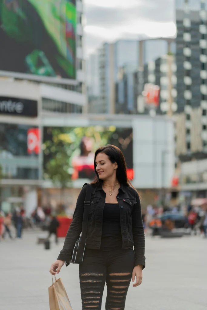 This is the ultimate weekend go-to! A classic black denim jacket over a simple top, paired with distressed black jeans, is a no-fail combo. Simple gold layered necklaces and a casual cross-body bag keep the look light and modern. It’s relaxed, effortless, and perfect for a day of shopping in the city.
