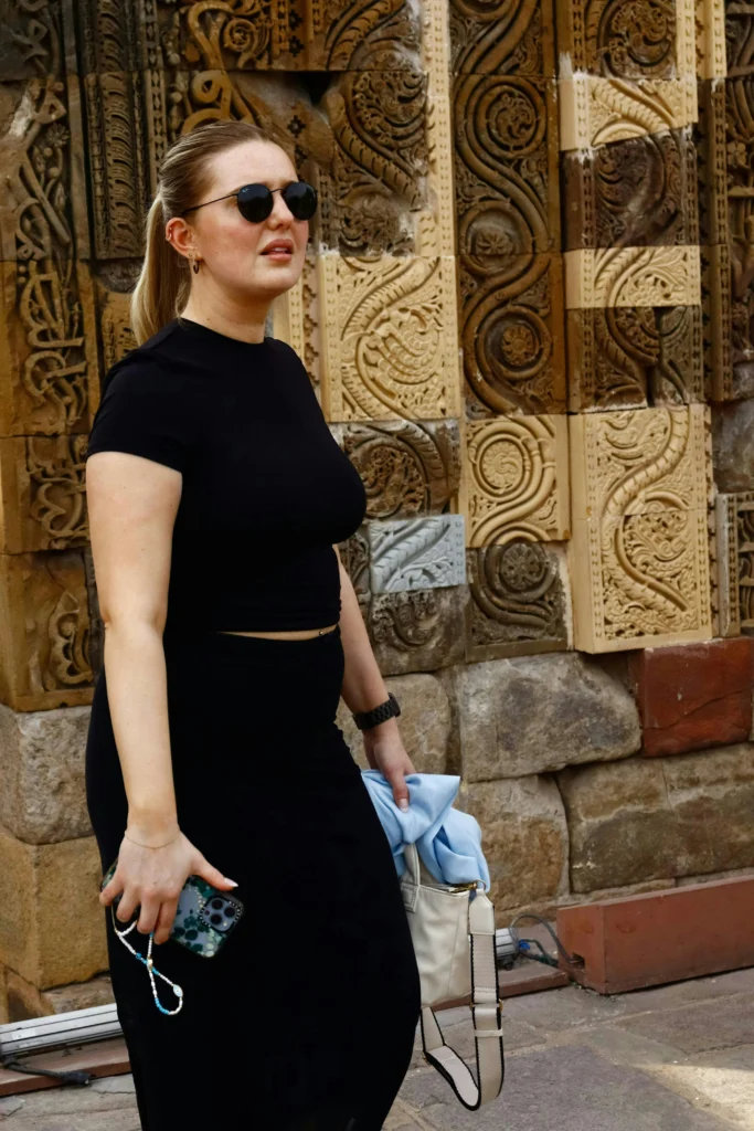 This look is a fantastic example of simple, comfortable style for traveling. A cropped black tee and maxi skirt create a clean line, while the sunglasses and watch keep it modern. It’s a chic and minimalist choice for a day of exploring, letting the amazing background shine.