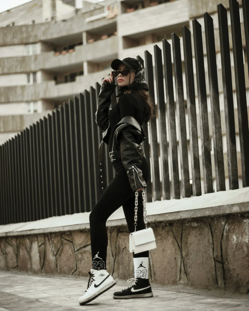 Talk about cool! This look merges sporty comfort with serious style. The black leggings and fitted top are elevated with a cool leather jacket casually draped on the shoulder. But the real stars? The high-top sneakers and those iconic ’23’ socks, giving off major retro basketball vibes. It’s perfect for running errands or a casual hang with friends—effortlessly cool.