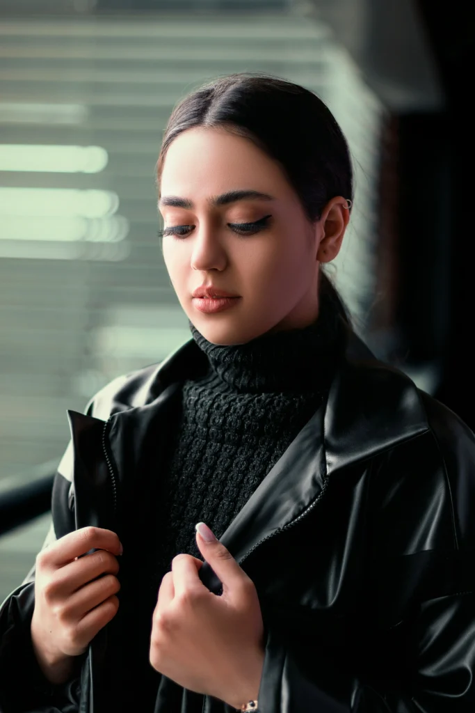 This is the quintessential cool-girl look. A perfectly fitted leather motorcycle jacket is worn over a cozy turtleneck, creating a clean, structured silhouette. The gold hoops and rings add a touch of glamour without losing the edgy feel. It’s a powerful, confident look that transitions seamlessly from day to night.