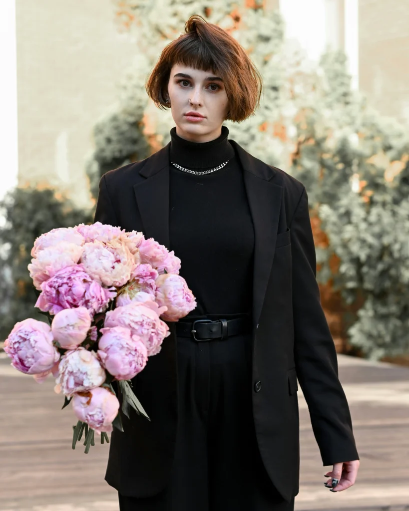 Who says all-black can’t be soft? This outfit is the perfect blend of tailored structure and feminine charm. The oversized blazer and black trousers give it that modern, confident feel, while the delicate silver chain and the vibrant bunch of pink peonies introduce a beautiful, unexpected contrast. It’s the perfect look for a formal event or an elevated date night.