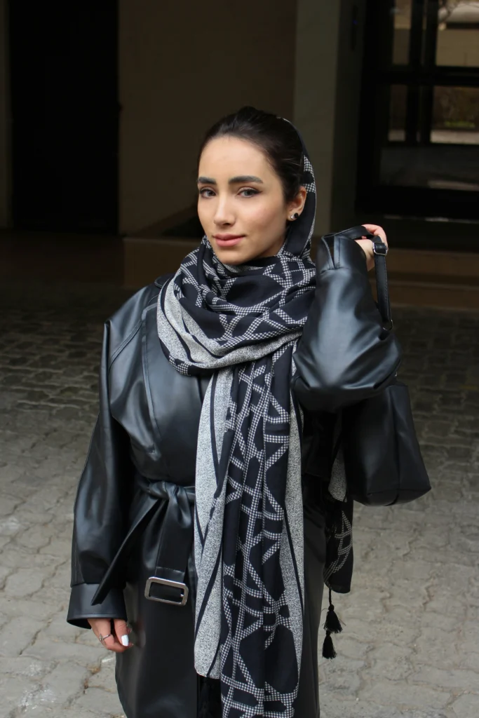 This outfit is a masterclass in how to break up an all-black look while keeping it chic. The belted faux leather coat adds a strong, structured silhouette. The hero piece is the dramatic black and white patterned scarf, beautifully draped to frame the face and provide a gorgeous contrast of texture against the leather. It’s a perfect look for staying stylishly warm!