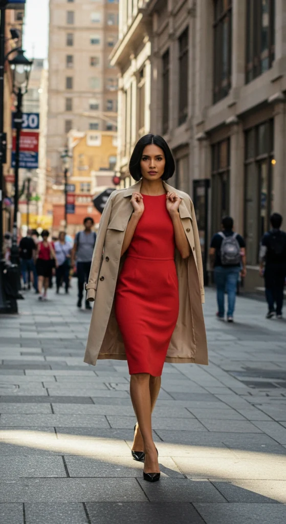 For a sophisticated and mysterious vibe, layer a classic beige or black trench coat over a fitted red dress. This combination is timeless, chic, and absolutely elegant. Pair with heeled boots or classic pumps and a sleek handbag. It’s perfect for a polished office look or a refined evening out. You’ll look like you just stepped out of a movie scene.
