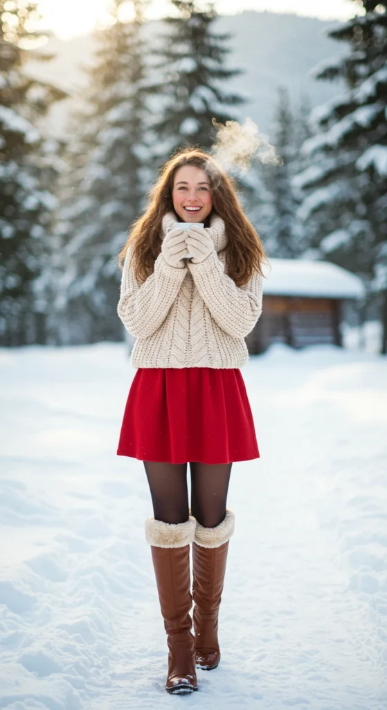 Don’t pack away your red dresses when the temperature drops! Layer a chunky knit sweater (cream, black, or grey) over a sleeveless red dress, making the dress look like a skirt. Add tights, knee-high boots, and a stylish wool coat. A cozy scarf can complete this warm and chic winter ensemble. Who says winter fashion has to be drab?