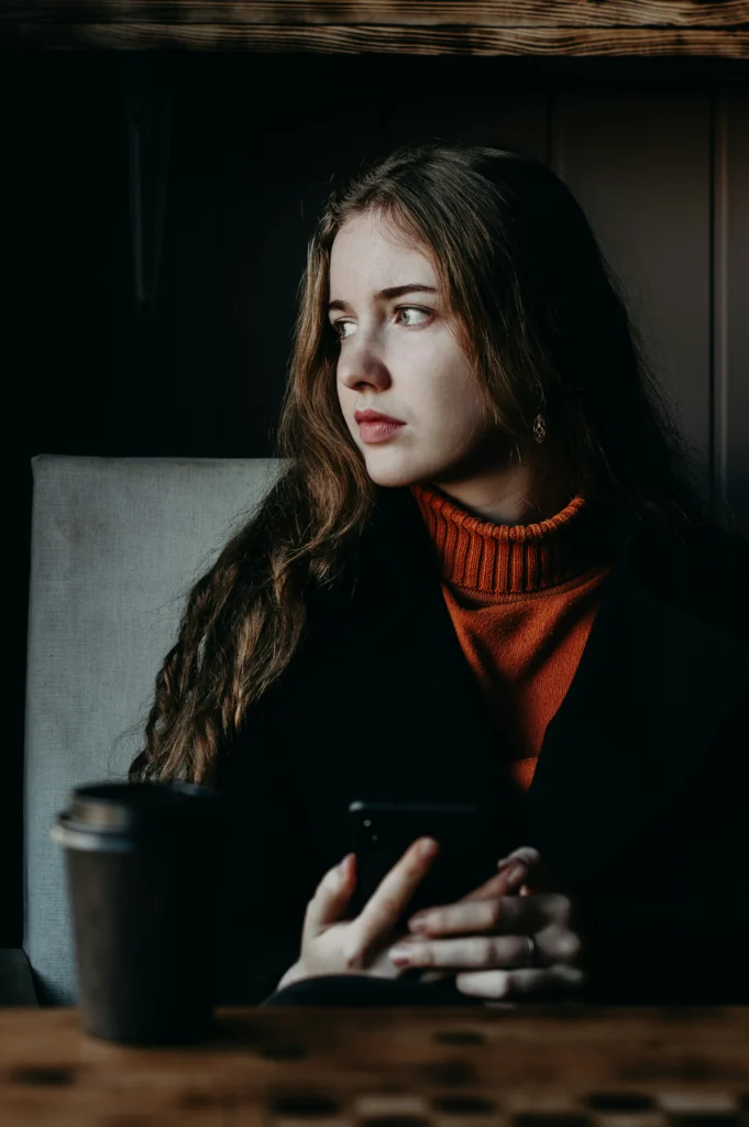 This picture is all about mood and rich, deep colors. The focal point is definitely that vibrant, ribbed orange turtleneck—it’s such a fantastic burst of color against the dark setting and the classic black coat. The high neckline provides warmth while the color draws all the attention. It’s a great example of how a single piece can anchor an entire winter ensemble.
