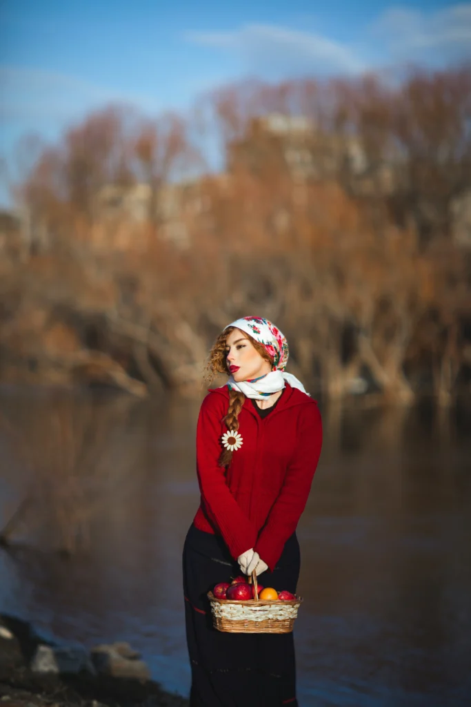 This is a beautiful, evocative look with a touch of classic folk style. The bright red knit cardigan is stunning, but the floral headscarf is what makes this truly unique. It’s tied neatly over her hair, which is styled in a long braid, perfectly framing her face. The gloves and basket of fruit add to the romantic, almost storybook feel.