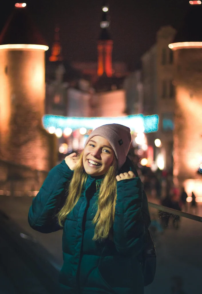 How adorable is this? A bright smile paired with a simple puffer jacket and a pale pink beanie is your go-to for a fun winter evening. The teal color of the coat is a beautiful contrast against the warm, glowing lights of the city backdrop. This look proves that being casual and warm can still be totally vibrant and cheerful!