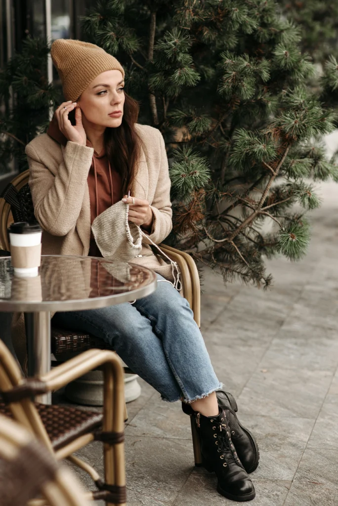 The perfect casual yet polished outfit for a coffee date or a little outdoor knitting! This look layers a soft hoodie under a structured, neutral blazer or coat. Paired with comfortable jeans and cool lace-up boots, it’s practical for a cooler day while still looking effortlessly put-together. It’s a masterclass in smart layering!
