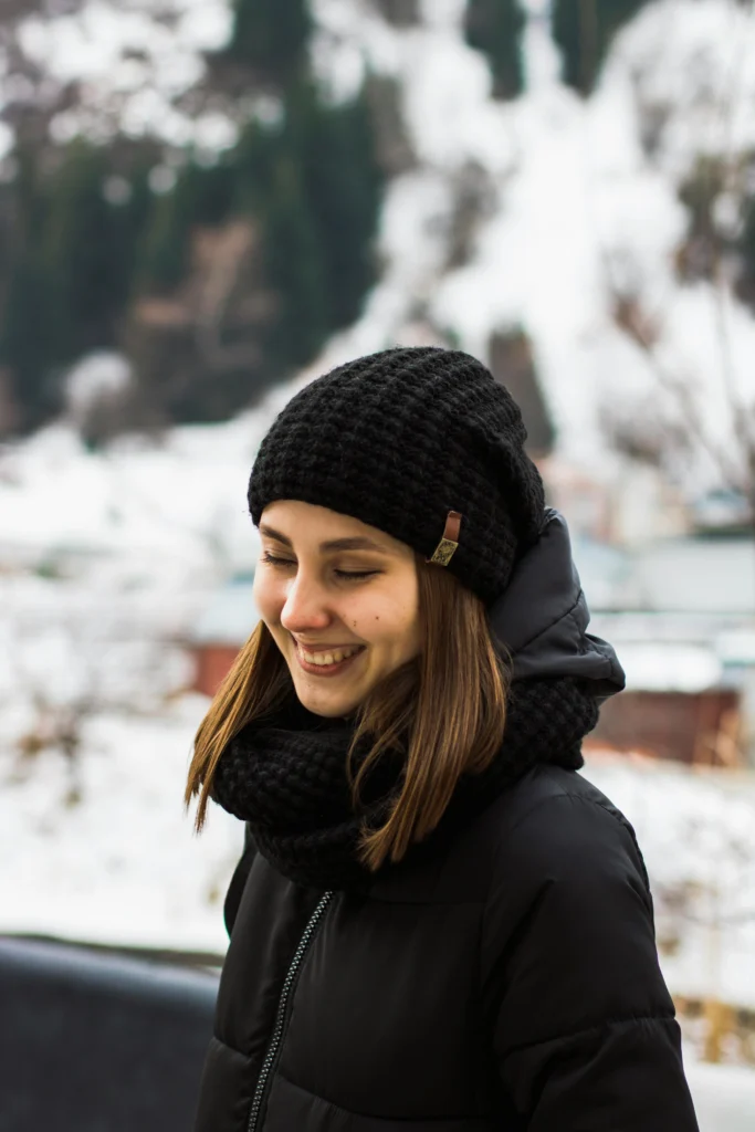 - Knitted Texture: Grab a thick, hand-knitted beanie and a matching circle scarf for maximum coziness.