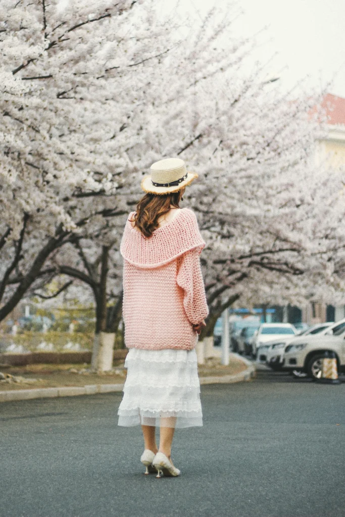 Maybe technically a spring look with those cherry blossoms, but the beautiful chunky-knit sweater is perfect for those mild late-winter or early-spring days! The oversized, off-the-shoulder pink sweater paired with a floaty white lace skirt and straw hat creates a whimsical, romantic vibe. It’s a great way to introduce light colors back into your wardrobe.