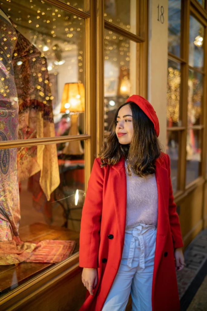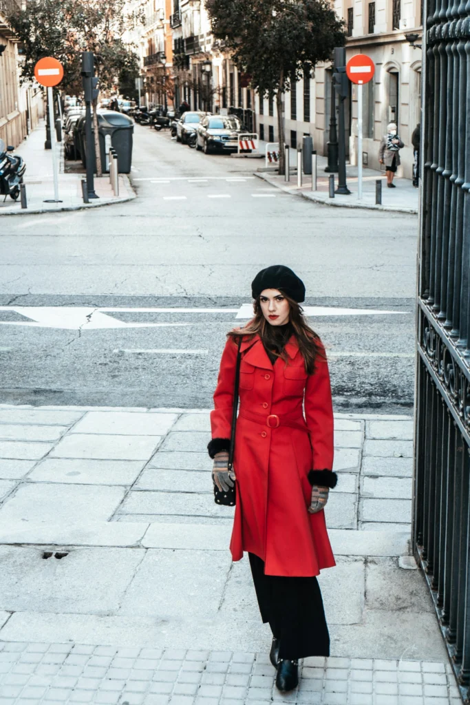 A long red trench coat is a major power move! This look is structured, bold, and perfect for walking the city streets. The red coat is brilliantly contrasted with the simple black wide-leg pants and a matching black beret. The defined waist from the belt keeps the coat from overwhelming the silhouette.