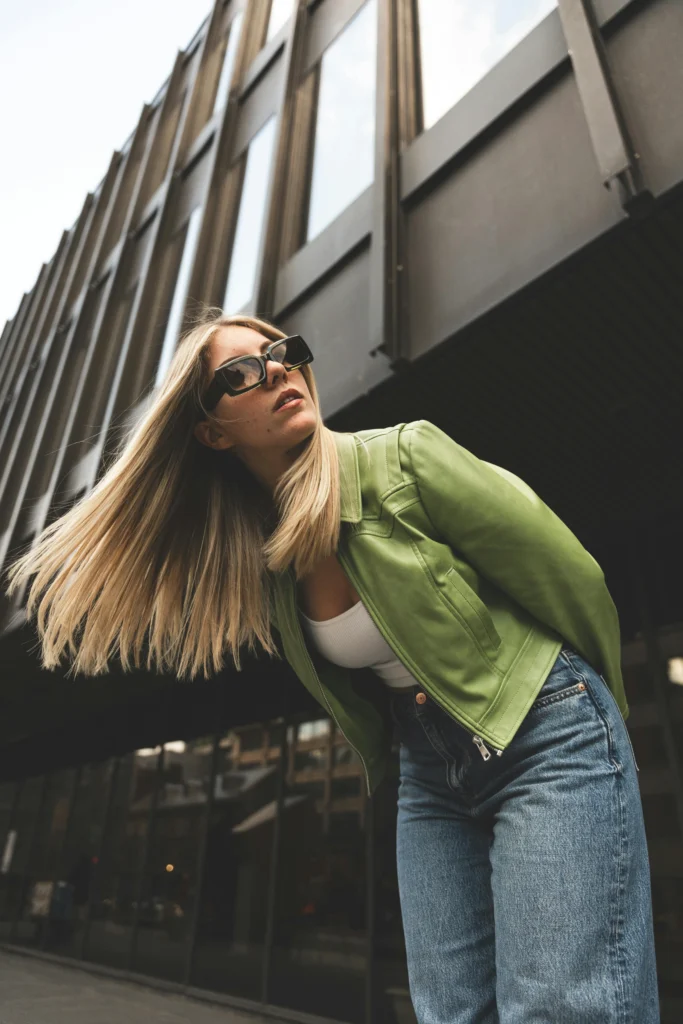 Okay, talk about a pop of color! This look screams confidence. Trading a boring winter neutral for this bright, lime-green leather jacket is a brilliant style move. Paired with a simple white tank and classic wide-leg denim, it’s a casual but unforgettable street style moment. This is how you beat the winter blues!
