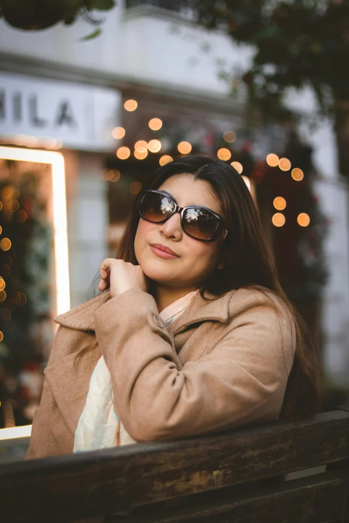 Camel is the ultimate timeless winter color. This camel coat paired with a simple scarf and oversized dark sunglasses is the definition of sophistication. The bokeh lighting in the background gives it a warm, inviting feel, but the outfit itself is polished and perfect for a stylish afternoon out.