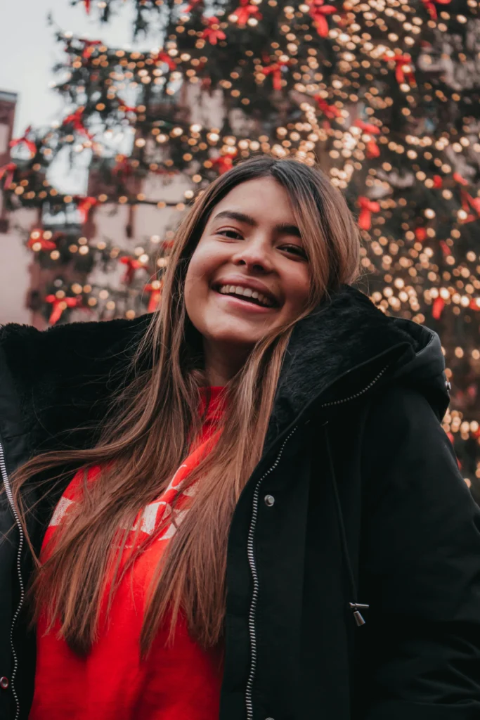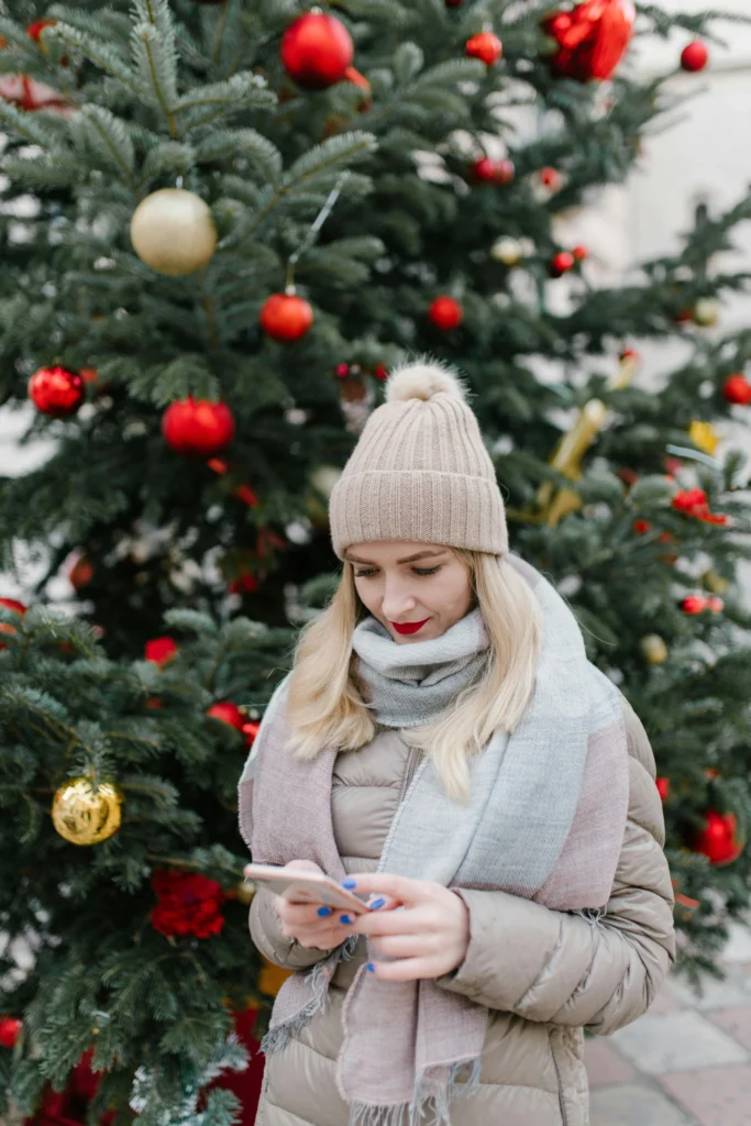 Cozy, cute, and ready for the holiday season! This look nails casual winter layering. The combination of a puffer jacket, a soft knit beanie with a pom, and a large plaid scarf is functional and fashionable. The neutral tones of the outerwear work beautifully against the festive Christmas tree colors.