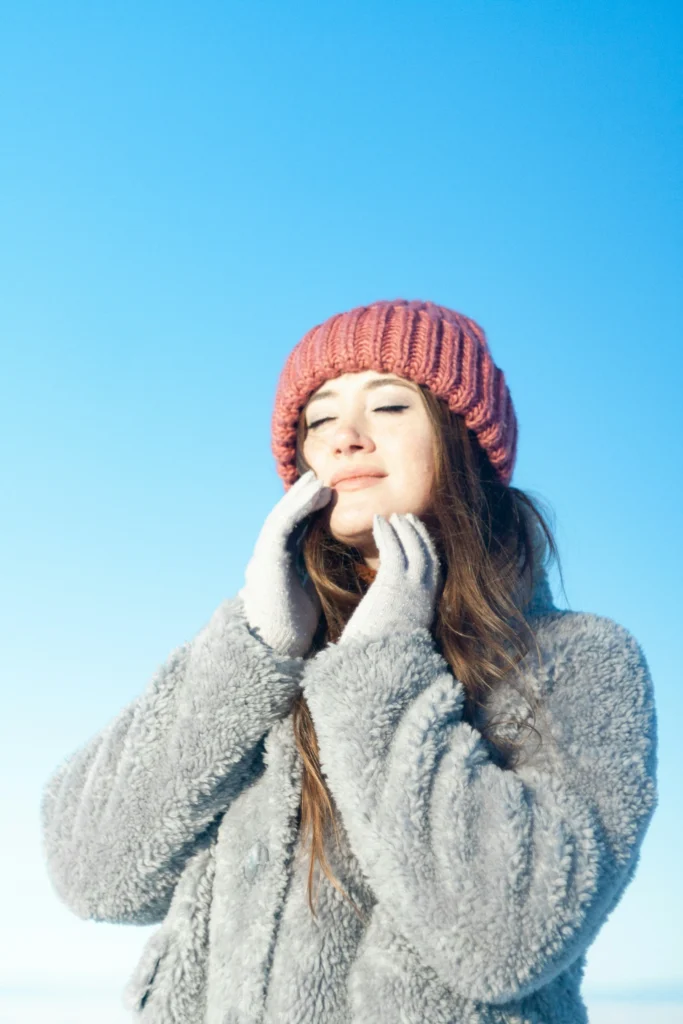 A peaceful, serene winter moment! The soft textures of the grey sherpa-style coat and gloves are beautifully contrasted with the warmth of the blush pink beanie. It’s a very tactile, gentle look that feels luxurious and cozy against the bright blue sky. Perfect for catching a few rays of winter sun!