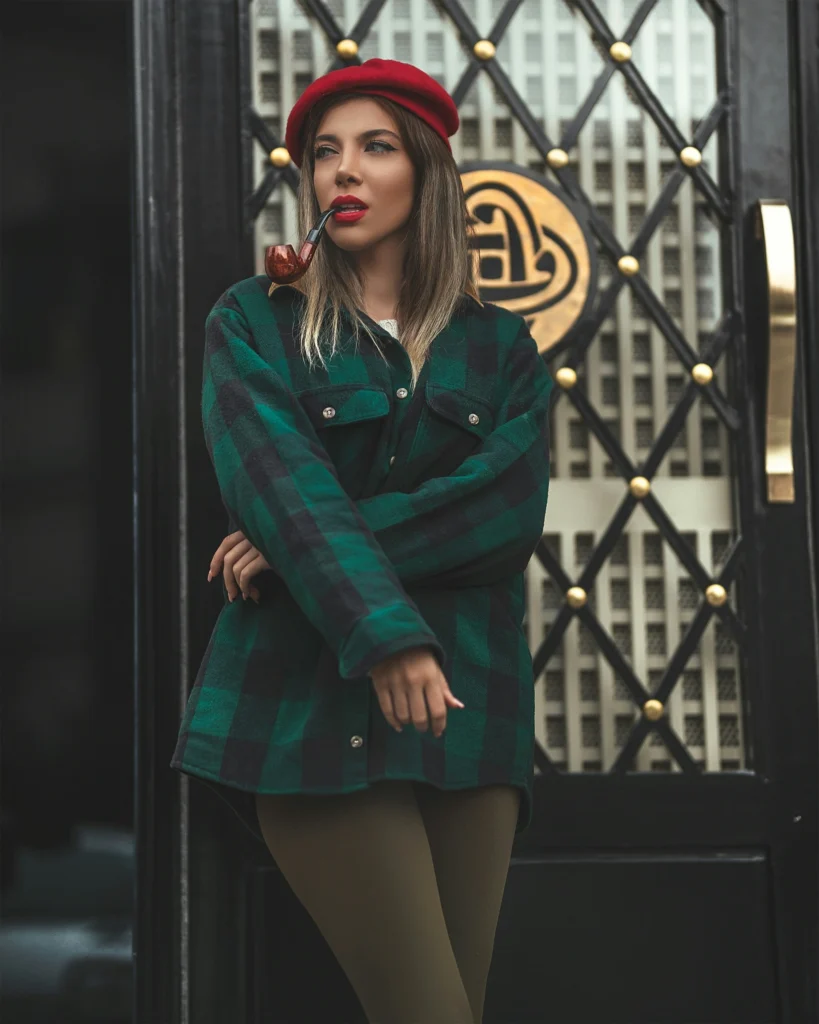 This is a bold, artistic take on winter layering! The foundation is a classic, oversized green and black plaid flannel shirt-jacket (or “shacket”), but the accessories take it to another level. The red beret and matching lipstick are a striking contrast that makes the whole look feel sophisticated and French-inspired.
