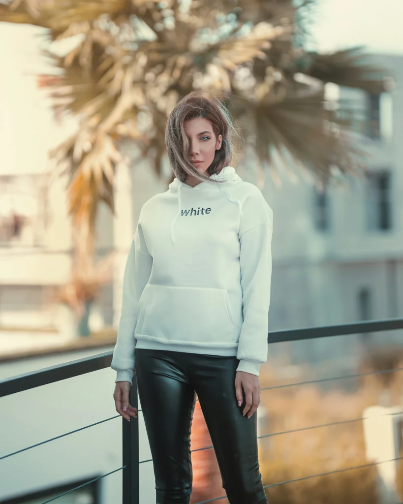 The ultimate cool-girl uniform! You can’t go wrong with the high-contrast pairing of a crisp white hoodie and sleek, black faux leather pants. It’s sporty, edgy, and effortlessly chic. The structured railing and palm tree background give this casual look an elevated, almost resort-wear feel for milder winter days.