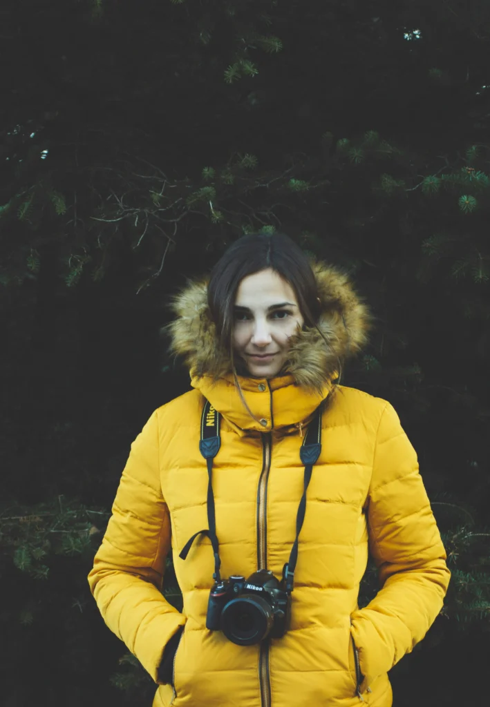 This look is a shot of pure sunshine on a gloomy day! A yellow puffer jacket is such a fun and unexpected choice for winter outerwear. The jacket’s fur hood and dark backdrop make the color feel even more striking and warm. It proves that you don’t have to stick to traditional dark colors when it’s cold!